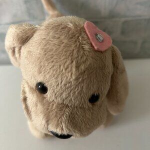 PUPPY DOG STUFFED ANIMAL PINK COLLAR WITH DIAMOND SEQUENCES HEART BOW WITH DIAMOND SEQUENCE ON TOP OF HEAD COLOR IS TAN LIGHT BROWN SIZE IS APROX 8 IN PRE OWNED GOOD CONDITION
