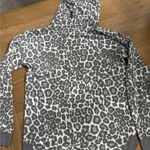 Stylish gray leopard print hoodie. Features a cozy hood and front pocket. Size small but fits more like a medium