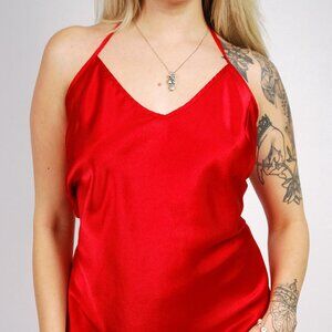 • Red hot!! Red satin mini halter dress with open back and criss cross tie in back.