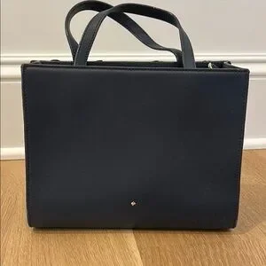 Elegant navy leather handbag with floral appliqué design. Perfect for any occasion.