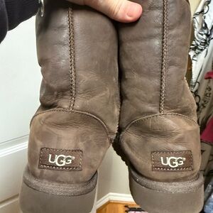 Stylish Tory Burch sandals in gray leather. Features signature logo detail. In used condition. Size 8.5