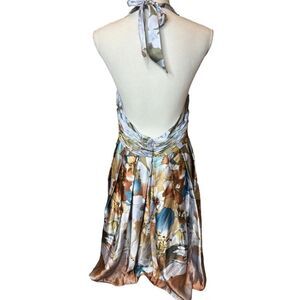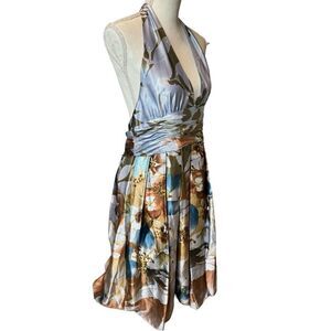 Adrianna Papell Occasions 100% Silk Blue Floral Halter Sequin Dress Y2K Sz 14