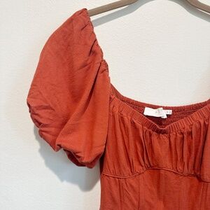 Worn and washed, in good condition. Puffed sleeve, can wear sleeves up for a square neck or do off the shoulder. Top is gathered, back is smocked. Side zipper. A line. Fully lined. Self is 55% Linen/45% Viscose, Lining is 100% Viscose. No trades.
