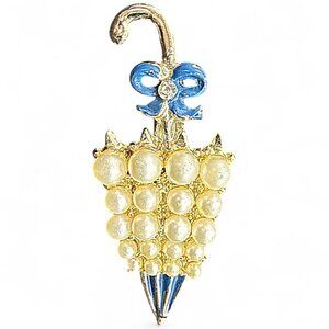 Add a little drizzle of charm to your ensemble with this umbrella brooch. Decked out with fancy faux pearls and a blue bow, it's the perfect way to 'weather' any storm in style. Don't get caught in the rain without it—at least figuratively speaking!