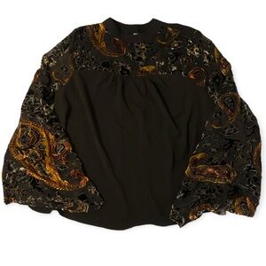 EUC. No flaws. Beautiful work bell sleeves with velvet paisley/floral pattern. Keyhole back with double buttons. Sleeve length is 26”, pit to pit is 22”.