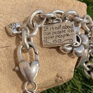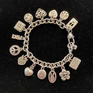 Brighton GIVE PEACE A CHANCE Charm Bracelet. Beautiful, fun and full of charm! Fourteen (14) silver plate charms with images, quotes and bejewels. Some of the charms have a different saying or image on the other side. Heart hook clasp that can be hooked on any link to make smaller. Approx. 8".
