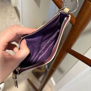 This cream wristlet features a sleek rectangular design with rounded corners, crafted from smooth leather. The attached wrist strap offers convenience, making it an ideal accessory for any occasion.