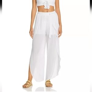Elegant white sheer wide-leg pants. Perfect for a breezy look. Aqua swim tulip overlap hem with side slits.