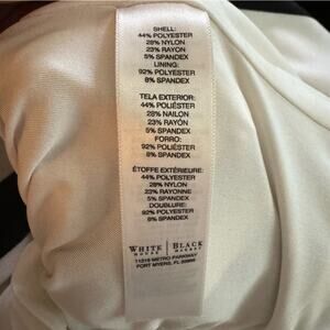 44% polyester/29% nylon/23% rayon/5% Spandex, Ponte knit. Lining: 92% polyester/8% Spandex. Machine washable. Dress has a silver colored metal bar at the neck, back zip. In excellent condition