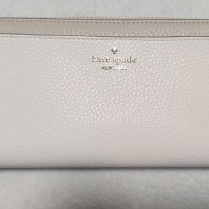This Kate Spade wallet in a sophisticated cream hue features a luxurious textured leather finish, offering both style and durability. The minimalist design is complemented by elegant gold accents, making it a timeless accessory for any occasion. Its sleek, rectangular shape ensures it fits seamlessly into any bag or can be carried on its own for a chic look.
