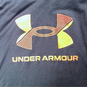 New Without Tags Youth XLarge Under Armour Hooded Polyester Pull Over WarmUp Athletic Shirt. The shirt is black with a fluorescent red Under Armour logo on the front. It is made of a lightweight, moisture-wicking polyester material. Original Care Tags Have Been Removed From Garment. Smoke Free Home. #underarmour #athleticshirt #pullover #hoodie