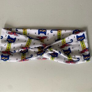 Teacher headband with a Very Hungry Caterpillar print. Features red, green, blue, and yellow accents on a white background. Perfect for adding a fun touch to any outfit.