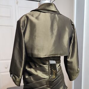 This stunning strapless evening gown features a beautiful olive green color, perfect for any formal occasion. New with tags. The elegant design is enhanced with a sparkling rhinestones embellishment, adding a touch of glamour. Measuring 52 inches long 20 inches armpit to armpit 18 inches waist. The shrug Measuring 13 inches long 17 inches sleeves adorned with Rhinestones. The bottom is lined with also a layer of tulle to give it fullness. Zipper on the back is 12 inches. #gown #formal #long #maxi #dress #olivegreen #strapless #trunkshow #jadecouture #designer #layered #prom #wedding #2pc #tulle #lined