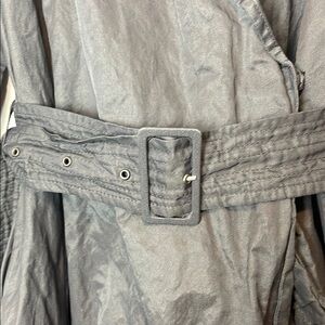 This trench coat has a dress-like fit with ruffled details at the sleeves and bottom hem. It features a waist buckle for a flattering silhouette and additional buckle accents on the sleeves.