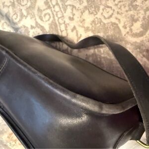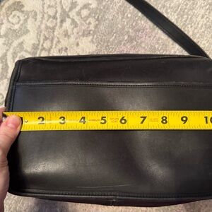 Vintage Coach Black Leather Zippered Rectangle Crossbody Bag. Some scratches on leather. Rubbing on the leather trim. See photos. One zippered pocket inside. Authenticity stamp inside. Measurements in photos.