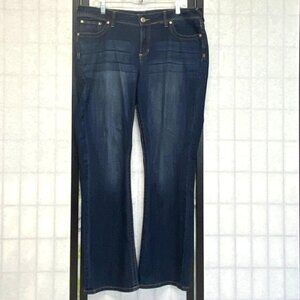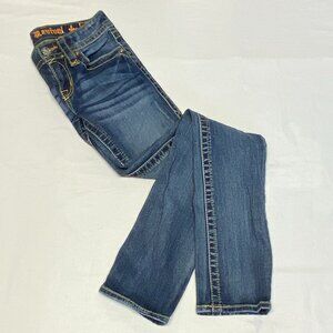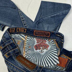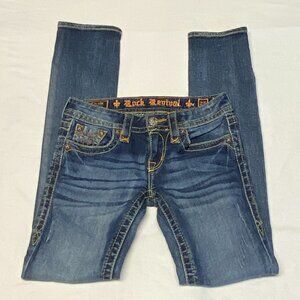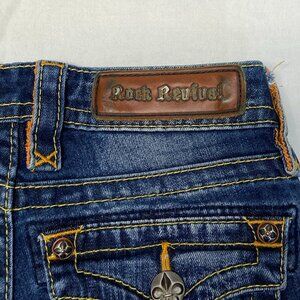 Low Rise Lightly Distressed Faded Straight Jeans from Rock Revival. Lovingly broken in, not torn or stained – look in excellent used condition. Mid weight stretch cotton blend with low rise slim silhouette in faded medium blue denim wash. Manufactured whiskering and fading on pockets edges and legs. Light distress mostly on legs and pockets. Belt-loop waistband with button closure and zip fastening. Classic back yoke and 5-pocket design. Double wide topstitching in yellow. Pockets have decorative rivets. Back has pocket flaps with fleur di lis buttons, also outlined embroidered fleur di lis design on pocket. Leather label on back waist, the metal bar is wearing to the outside - see photos.