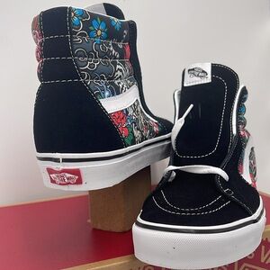Stylish Vans high-top sneakers with a vibrant floral design. Features a black base with colorful floral patterns and white accents.