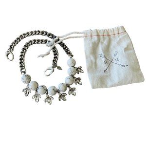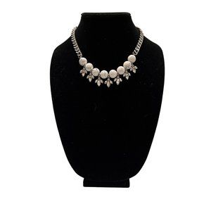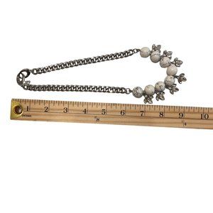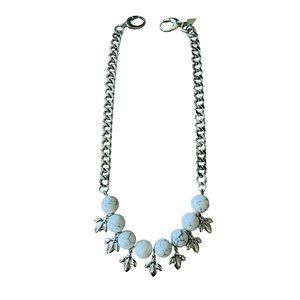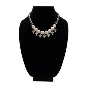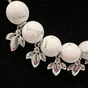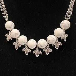 Silver tone necklace with white marble looking beads, silver and rhinestone stations.