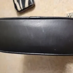 Stylish and almost new Dooney & Bourke wallet and cosmetic set with zebra print. Features black and cream colors on the outside. Well cared for. Wallet is 8 inches long and cosmetic case is 6 inches long and 1 inch wide at bottom. Pill box, too.