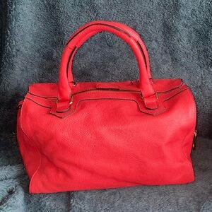 This bright salmon colored satchel showcases a classic rectangular shape with smooth, high-quality leather that exudes sophistication. Its structured design and vibrant color make it a perfect accessory for adding a touch of elegance to any outfit.