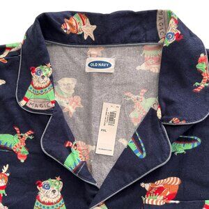 Indulge in comfort with this festive Old Navy pajama set. Featuring whimsical holiday animals, these pajamas are crafted from soft flannel for a cozy night's sleep. The button-down top and matching pants offer a relaxed fit, making them an ideal choice for lounging in style during the holiday season. Please see photos for small runs in the fabric.