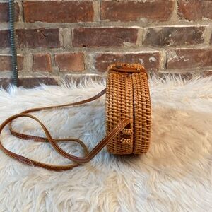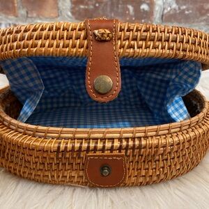Oval Woven Rattan Bag with Long Leather Strap.
