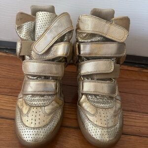 Isabel marant. Size 37. Stylish gold high-top wedge sneakers with a unique design. Perfect for adding a touch of glam to any outfit.