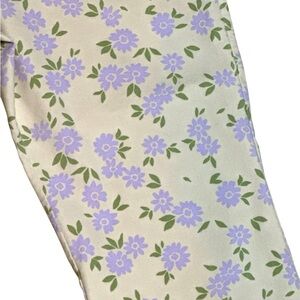 Stylish floral print pants with a blend of purple and green hues on a cream background. Perfect for a chic look.