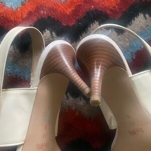 Step out in style with these Coach elegant cream patent leather slingback heels. Perfect for any occasion, these shoes offer both comfort and sophistication. Some wear to bottom from walking on hot asphalt. Small stacked heels