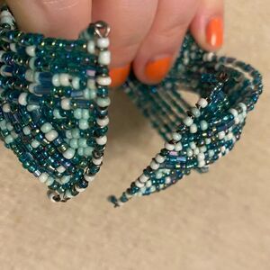 Blue seed bead brained wide cuff bracelet adjustable size coastal. It’s adjustable so one size fits all. The width measurement is in the photos.