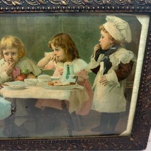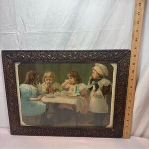 This charming vintage art print features a delightful scene of children at a table, beautifully framed in an ornate brown frame. Perfect for adding a touch of nostalgia to your home decor.