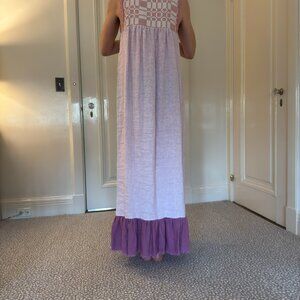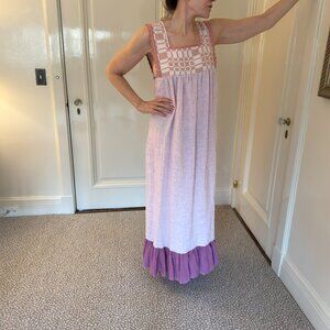 Beautiful Nina Leuca maxi dress. 80% linen, 20% cotton, 100% handmade in Italy. Bodice woven peach and cream geometric pattern, body heathered pink, lavender lower ruffle, hand-cut hem. Never worn.