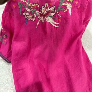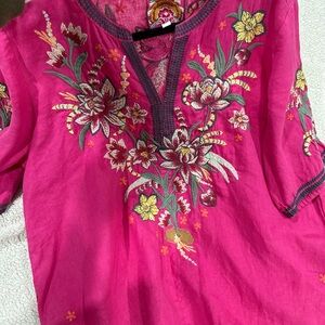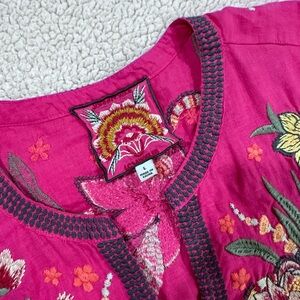 JOHNNY WAS Embroidered Linen Magenta Bohemian Shabby Chic Tunic Top SZ L