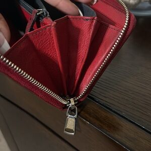 Chic YSL wallet in black and red leather. Features iconic logo and gold zipper.