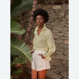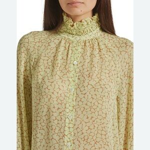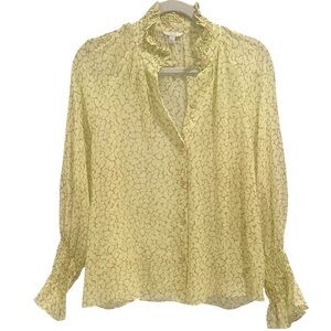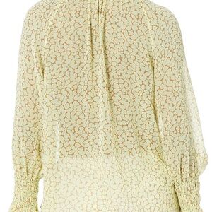 JOIE Dea Top in Shadow Lime with brown geometric dotted pattern. This is an extra-romantic button-down from the ruffled high-collar to the Edwardian-inspired sleeves. Button closure at neck. Wear it opened at the neck or closed (see pic). An intricate print completes the effect. 100% sheer. This shirt is sheer. Excellent condition! Fits true to size.