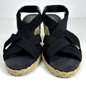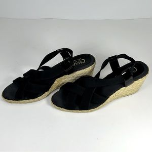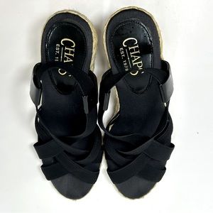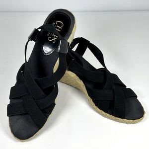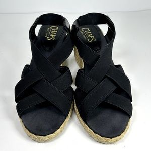 Chaps Della Espadrille Wedge Sandals w/a 2.25" heel, slip-on design that makes for easy on and off, elastic and manmade uppers, a fabric/TPR outsole, open toe and lightly padded footbed, size 7 Women's. Sandals are gently used in very good condition.