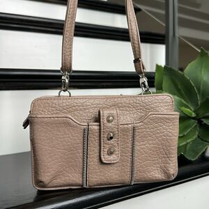 This genuine leather coach wristlet is easy to grab and go and is unique with the coach name and logo in gold toned lettering on the front. The bag has a zipper that not only goes along the top but down part of the side, allowing easy access and view of what’s inside. The inside fabric is immaculately, clean and matches the bag. This couch feels soft and luxurious to the touch and measures approximately 9 1/2 inches long and approximately 6 inches tall. Non-smoking and clean. The black and gold toned wristlet strap is removable and in excellent condition. The wristlet strap is not original the bag. Like new condition perfect no matter the season and great to hold your cell phone, wallet and necessities.