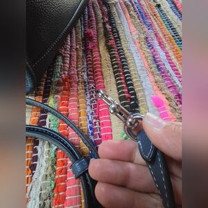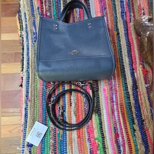crossbody long strap or short handles. denim blue in color. few indents from being stored. silver hardware
