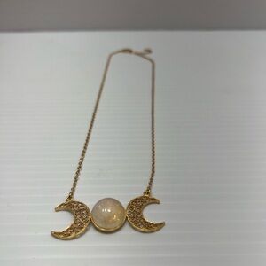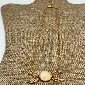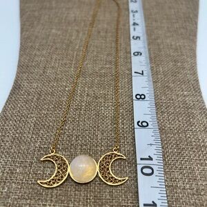 This stunning gold necklace showcases a celestial theme with a mesmerizing moonstone at its heart. The central stone is flanked by crescent moon charms, each adorned with intricate filigree work, all elegantly suspended on a delicate gold chain. A timeless piece that exudes ethereal beauty.