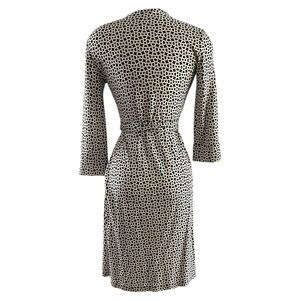 Stylish wrap dress with a black and white pattern. Features a tie waist and three-quarter sleeves.