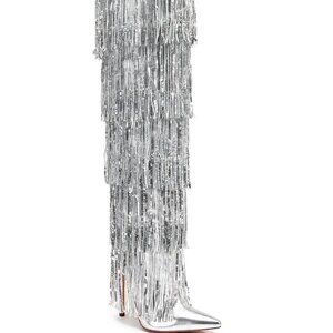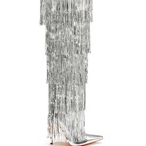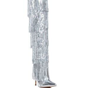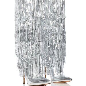 You can grab the last pair of Callie Chrome: Sequin Fringe Silver Stiletto Boots now.