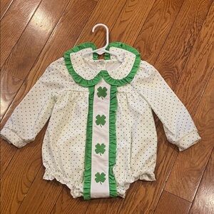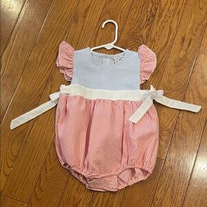 Adorable baby romper with green and light green colors. Features ruffled edges and adjustable straps. Smocking. Barely worn. Excellent condition