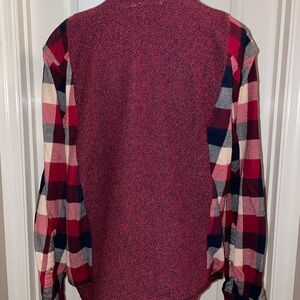 Stay cozy and stylish with this Southern Methodist University sweater. Featuring a bold red and navy flannel shirt design, it's perfect for showing your school spirit, or if you just like horses. Soft flannel and cozy woolly threads brand sweatshirt. I left part of the chest pocket on so it can hold one pen or pencil. Made by me, has been washed. Smoke free home. For like a M/L in Between size.