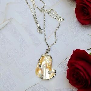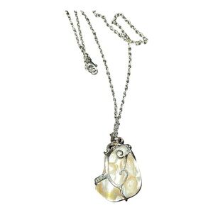 The necklace features a baroque mother of pearl pendant on a silver chain. The pendant, exhibiting an irregular shape, displays a milky white color with soft pink iridescence. It is wrapped with hand-built sterling silver detailing, adding to its unique design. The chain is a standard, likely cable-style, silver chain. Mother of pearl, also known as nacre, is a material produced by mollusks as an inner shell layer and is valued for its shimmering appearance and durability. The pendant's baroque shape refers to its irregular, non-spherical form, which is a popular style for pearls and mother of pearl.