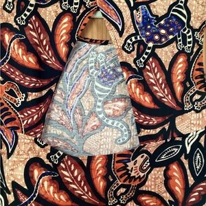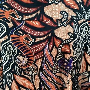 Vibrant sleeveless dress with a bold animal and leaf print. Features shades of orange, black, and blue. Take a look at the peek a boo back! So cute, and just a bit daring!