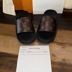These Versace sandals feature a striking black and gold design, highlighted by a bold Medusa head embellishment. The open-toed style and flat sole offer a blend of comfort and luxury, making them perfect for casual outings.