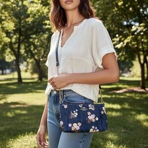 Coach Denim Chic and stylish, this Coach crossbody bag features a beautiful floral design on denim. Perfect for adding a touch of elegance to any outfit. Please see all photos. Only Call out is rubbin on both bottom sides.