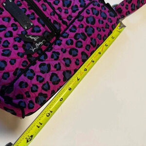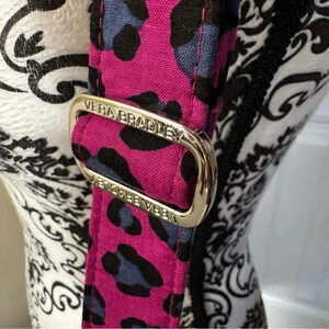 Vibrant purple with blue and black animal quilted Vera Bradley crossbody bag, 2 front pockets, 1 large zippered pocket key, silver hardware, branded ribbon pulls on the zippers. New but tags have been removed (gift I never used). Smoke free home.
