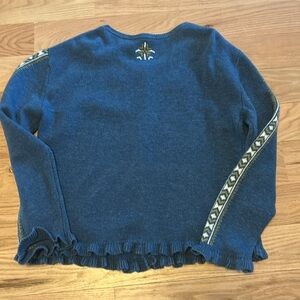 Stylish blue sweater with intricate embroidery. Features unique patterns on the front and sleeves. Ruffled sleeves and hem, 80% lambswool.