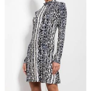 Indulge in modern elegance with the Fernanda Dress by Tart Collections, featuring sleek long sleeves and a mockneck for a sophisticated look. Crafted from a blend of 95% Rayon and 5% Spandex, this patterned mini dress boasts an A-line silhouette in a vibrant Tribal Stripe. It features a convenient pull-on closure and provides a comfortable fit while ensuring effortless maintenance. Care instructions include machine washing cold with like colors, line drying, and ironing with a warm iron if needed. Model is 5'8" wearing a size X-Small.